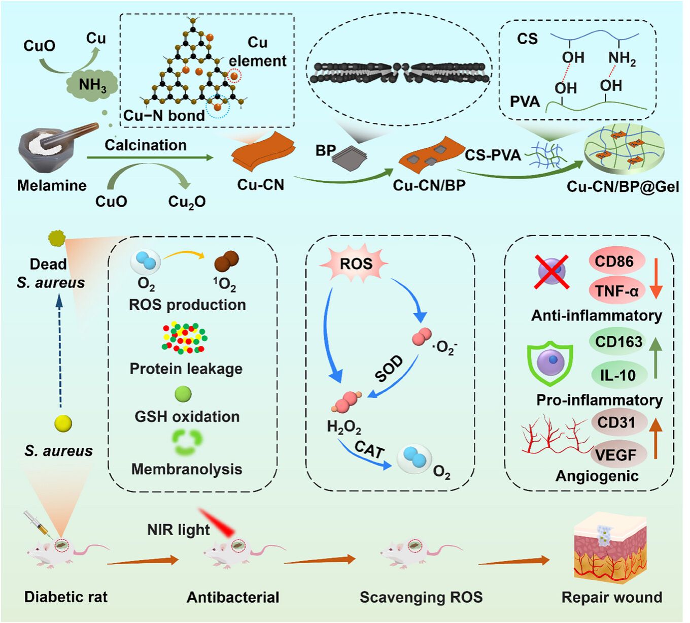 Hanpeng Liu, Liguo Jin, Shengli Zhu, Zhaoyang Li, Hui Jiang, Xiangmei Liu,* Accelerating Interface NIR-Induced Charge Transfer Through Cu and Black Phosphorus Modifying G-C3N4 for Rapid Healing of Staphylococcus aureus Infected Diabetic Ulcer Wounds, Small, 2025, Early Access. https://doi.org/10.1002/smll.202500378