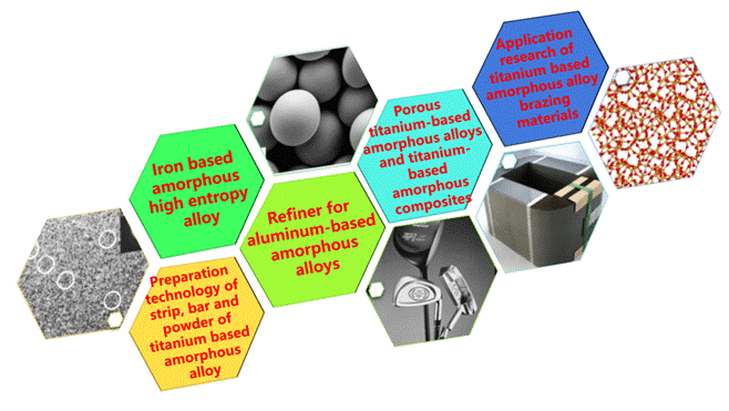A number of series of high-performance amorphous alloy systems have been designed and developed, and applied research has been carried out in different fields, the main contents include: strip, bar and powder preparation technology of Ti based amorphous alloy; Porous Ti-based amorphous alloys and Ti-based amorphous composites; Application research of Ti based amorphous alloy brazing materials; Study on Al based amorphous alloy and its application in grain refinement of aluminum alloy; Study on soft magnetic properties of Fe-based amorphous high entropy alloys.