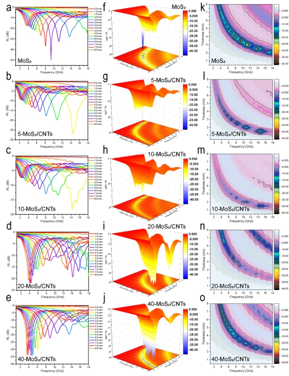 Figure 3. (a) RL spectra of MoS2. (b) RL spectra of 5-MoS2/CNTs. (c) RL spectra of 10-MoS2/CNTs. (d) RL spectra of 20-MoS2/CNTs. (e) RL spectra of 40-MoS2/CNTs. (f) 3D RL spectra of MoS2. (g) 3D RL spectra of 5-MoS2/CNTs. (h) 3D RL spectra of 10-MoS2/CNTs. (i) 3D RL spectra of 20-MoS2/CNTs. (j) 3D RL spectra of 40-MoS2/CNTs. (k) The contour RL spectra of MoS2. (l) The contour RL spectra of 5-MoS2/CNTs. (m) The contour RL spectra of 10-MoS2/CNTs. (n) The contour RL spectra of 20-MoS2/CNTs. (o) The contour RL spectra of 40-MoS2/CNTs.