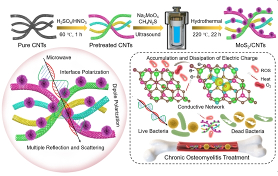 微波治疗是一种很有前途的治疗工具,因为它可以穿透生物组织,而对周围健康细胞和组织的衰减可以忽略不计。碳纳米管(CNTs)具有密度低、导电性好、比表面积高的特点。然而,单独的CNTs由于其高导电性而表现出较差的微波吸收性能,导致阻抗失配。CNTs与材料不同介电性能的结合通常会形成非均质界面,并产生丰富的界面偶极子。由于二硫化钼(MoS2)较大的比表面积和缺陷处的界面极化,发现二硫化钼具有显著的介电和吸收特性。然而,由于其导电性弱,其界面阻抗匹配受到限制。单靠二硫化钼很难获得优异的电磁性能,因此有必要在其中加入高导电性材料以提高其性能。因此,本研究设计了CNTs与MoS2片状纳米花的组合,可以产生阻抗匹配、传导损耗、极化损耗和多次散射的协同效应。在微波照射下,MoS2/CNTs产生大量的热量和活性氧(ROS),通过微波热疗(MTT)和微波动力疗法(MDT)联合治疗金黄色葡萄球菌感染的慢性骨髓炎。