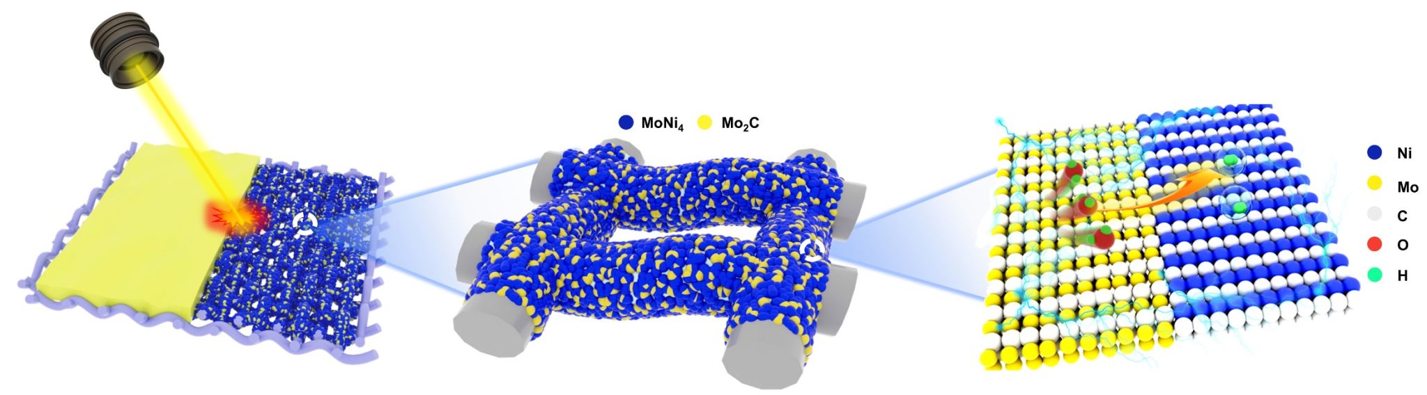 与此同时,采用传统方法(如水热法、电沉积法等)制备镍基催化剂存在产率低、规模小等缺点,不适合实现大规模生产和商业化应用。因此,亟需探索一种低成本、方法简单、适用于大规模制备的合成方法。为此,金属功能材料研究团队提出了一种激光辐射技术制备异质结催化剂方法(图1)。在高能激光的照射下,原料中的有机溶剂迅速碳化形成碳蒸汽,与钼粉反应生成Mo2C。同时,在局部高温高压环境下,钼粉与镍粉反应生成主相MoNi4,得到Mo2Cx/MoNi4/NM异质结构(图2)。