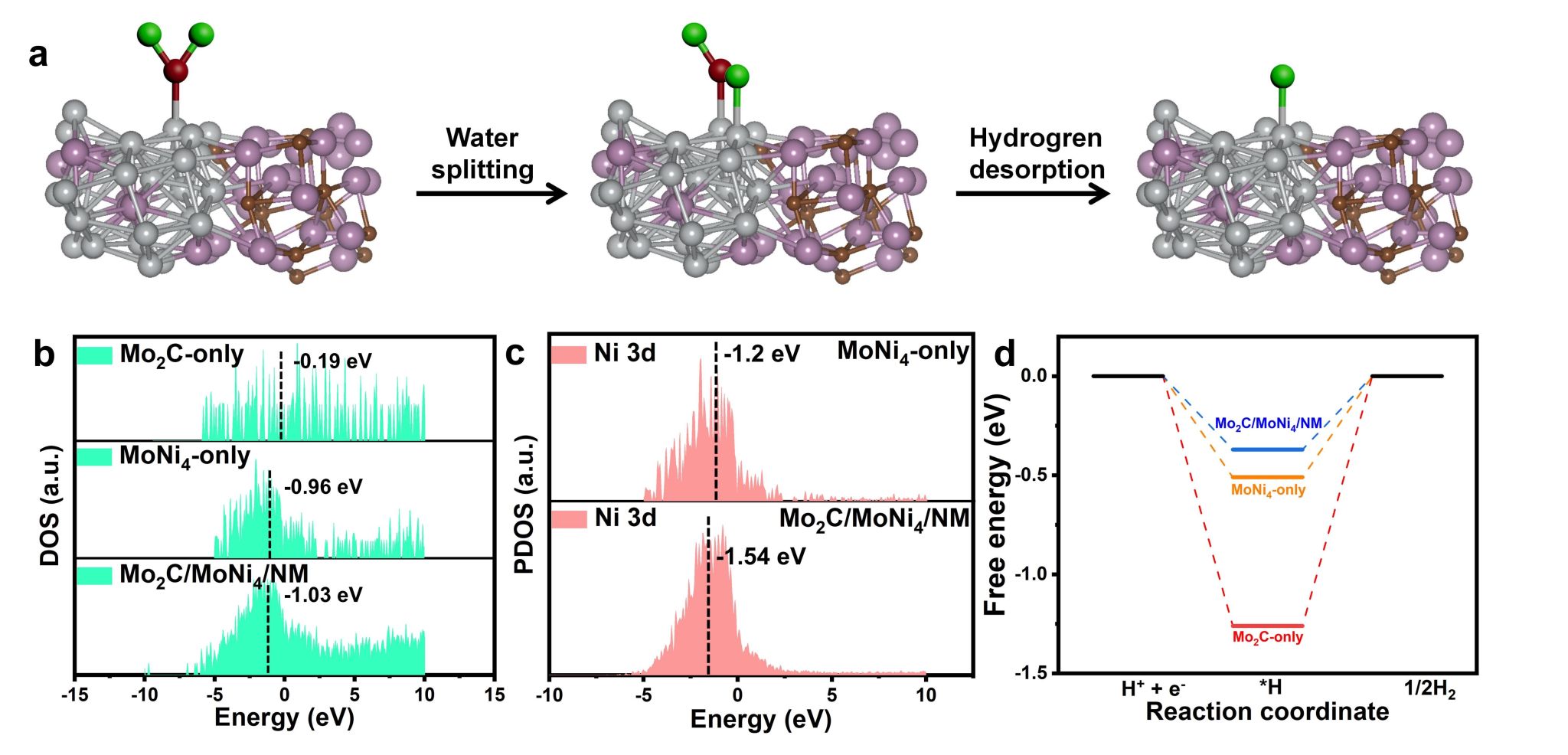 图4. (a)在Mo2C/MoNi4/NM(灰色、蓝色、棕色、红色和绿色球体分别代表Ni、Mo、C、O和H原子)上的反应机理示意图。(b) Mo2C-noly, MoNi4-noly and Mo2C/MoNi4/NM的态密度(DOS)。(c)不同催化剂的分波态密度(PDOS)。