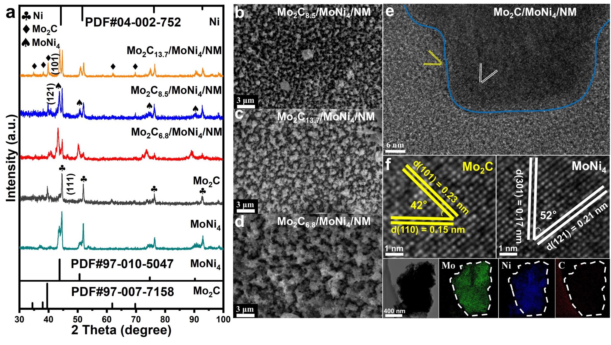 图2.(a) Mo2C13.7/MoNi4/NM, Mo2C8.5/MoNi4/NM, Mo2C6.8/MoNi4/NM, Mo2C-only, 和 MoNi4-only经过激光处理后的XRD谱图。(b) Mo2C8.5/MoNi4/NM, (c) Mo2C13.7/MoNi4/NM 和 (d) Mo2C6.8/MoNi4/NM的SEM图像。(e) Mo2C/MoNi4/NM的透射电镜。(f) Mo2C/MoNi4/NM的HRTEM图像和(g) EDS映射图像。