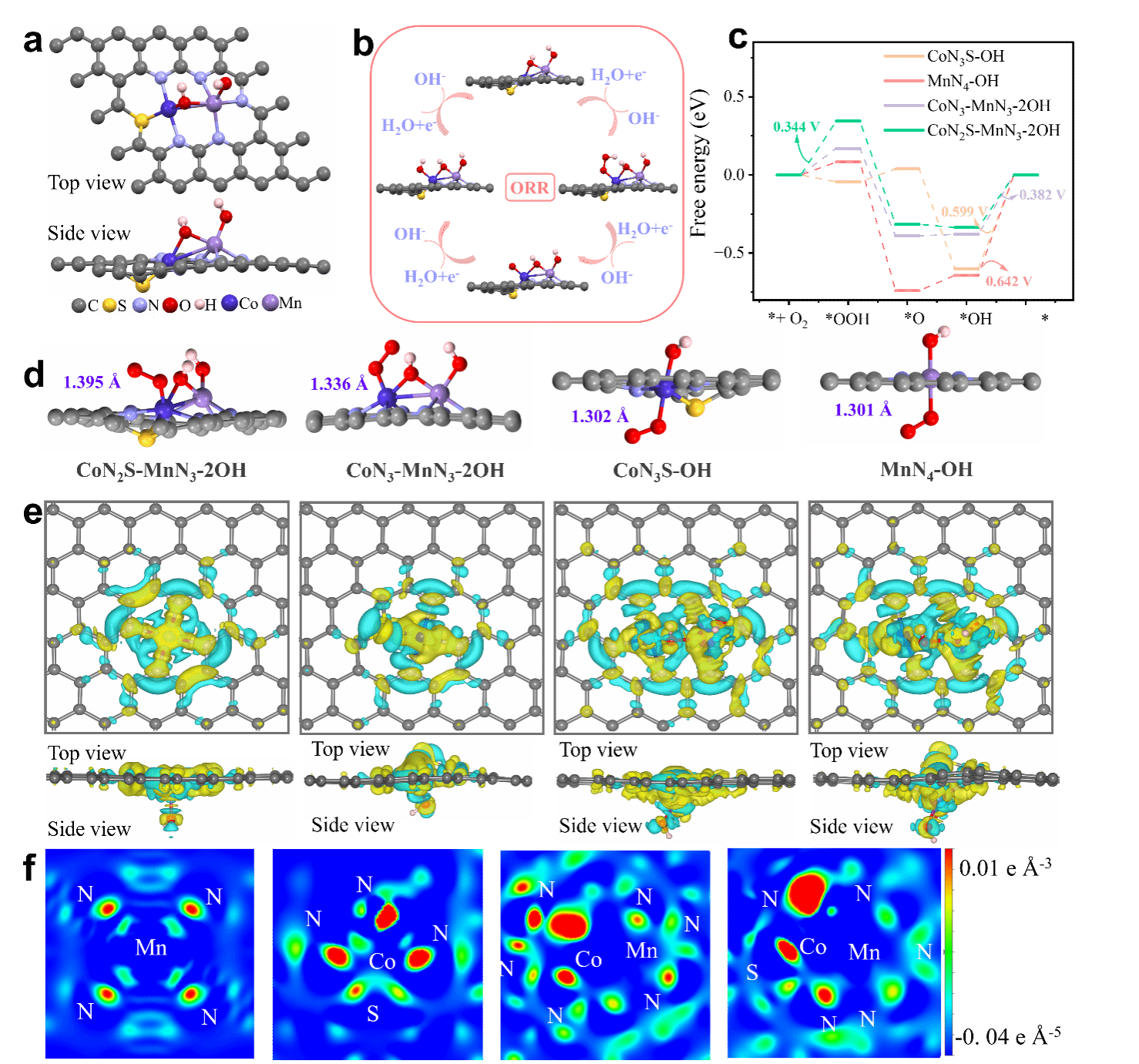 图4.(a)吸附*OH后CoN₂S–MnN₃–2OH模型的优化结构;(b)CoN₂S–MnN₃–2OH表面氧还原反应(ORR)过程示意图;(c)在电位U=1.23 V条件下,CoN₃S–OH、MnN₄–OH、CoN₃–MnN₃–2OH 和CoN₂S–MnN₃–2OH的自由能变化图;(d)O2分子吸附在CoN₃S–OH、MnN₄–OH、CoN₃–MnN₃–2OH和CoN₂S–MnN₃–2OH模型表面后的侧视图,其中每个数值表示O–O键长;(e)CoN₃S–OH、MnN₄–OH、CoN₃–MnN₃–2OH和CoN₂S–MnN₃–2OH的差分电荷密度俯视/侧视图;(f)上述模型的电荷密度差分分布图,其中蓝色到红色表示电荷密度从降低到增加的过渡。