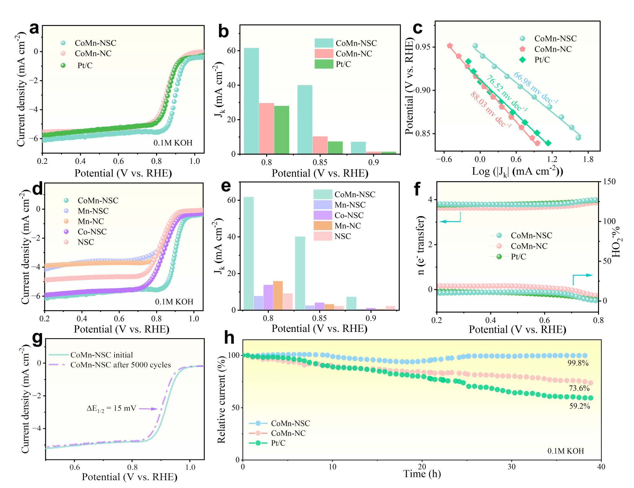 图3.(a)制备的CoMn-NSC阴极与CoMn-NC和商业Pt/C的ORR极化曲线对比;(b)在0.80、0.85和0.90 V下的动力学电流密度;(c)ORR的Tafel斜率曲线;(d)催化剂的ORR极化曲线对比;(e)在0.80、0.85和0.90 V下的Jk比较;(f)计算得到的电子转移数和H2O2 产率;(g)CoMn-NSC的加速稳定性测试;(h)计时安培测试。