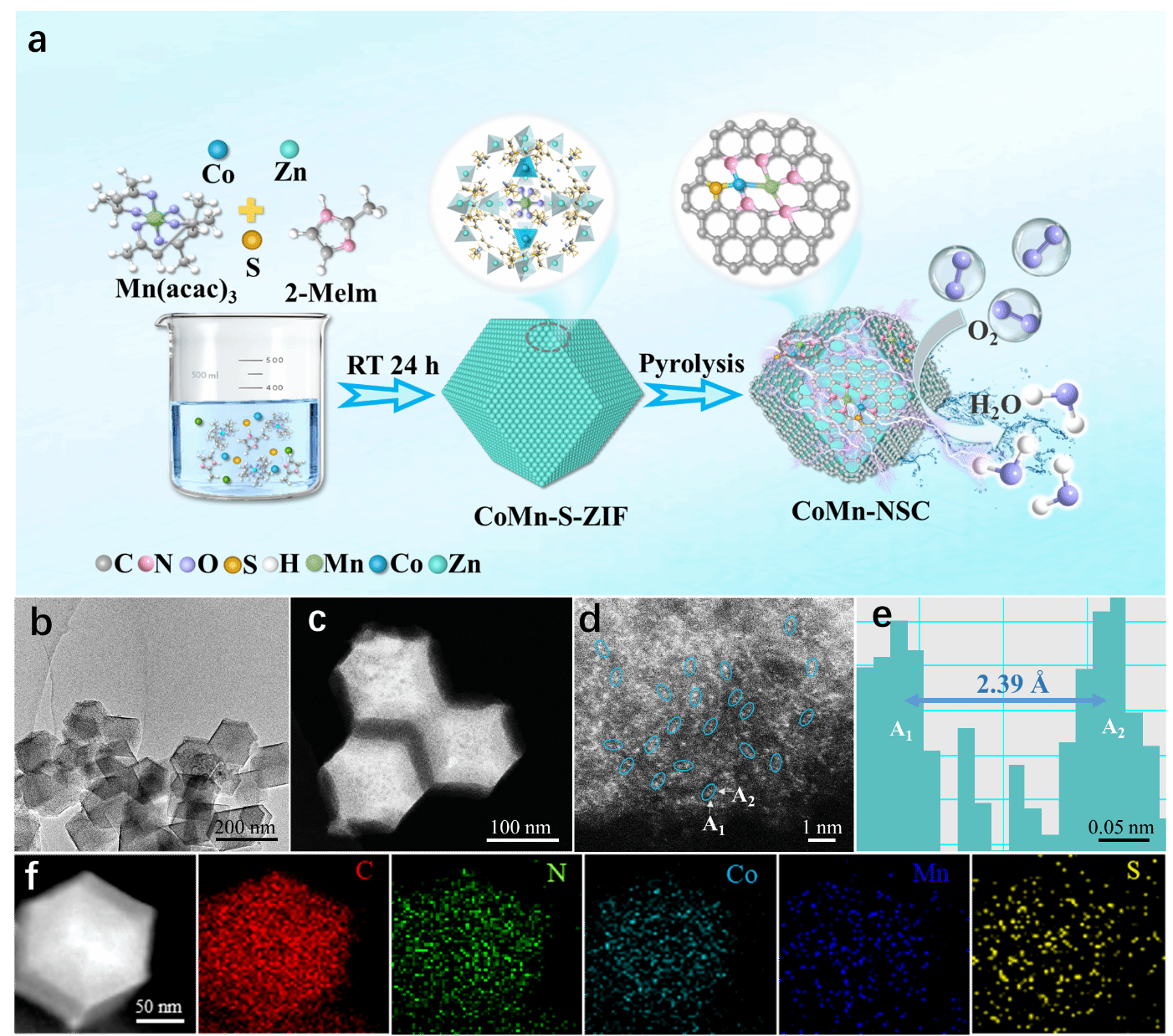 图1.(a)CoMn-NSC样品的形成过程示意图;(b)CoMn-NSC的透射电子显微镜(TEM)图像;(c,d)CoMn-NSC在不同放大倍率下的像差校正环形暗场扫描透射电子显微镜(HAADF-STEM)图像;(e)图(d)中原子位点A1与A2的强度剖面图;(f)CoMn-NSC的STEM图像及其能谱元素分布(EDX mapping)图像