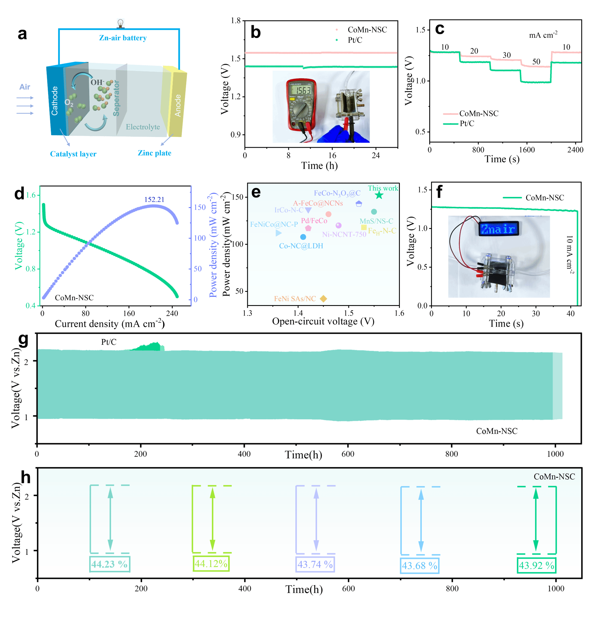 图5.(a)自制可充锌空气电池(ZAB)的结构示意图,以及以CoMn-NSC为ORR氧电极的电池性能;(b)开路电压(OCV)曲线;(c)在不同放电电流密度(10至50 mA cm-2)下的放电平台;(d)放电极化曲线及对应的功率密度曲线;(e)不同催化剂柔性锌空气电池的开路电压与峰值功率密度比较;(f)在10 mA cm-2电流密度下的放电曲线;(g)以CoMn-NSC和Pt/C为催化剂的可充锌空气电池在 5 mA cm-2电流密度下的恒流充放电循环性能;(h)CoMn-NSC 催化剂在循环100、300、500、700和1000 小时下的电压效率变化图。