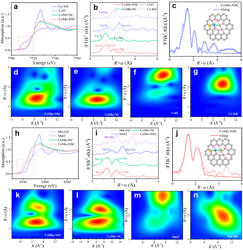 图2.(a)归一化Co K边XANES光谱;(b)k2加权EXAFS光谱的傅里叶变换的对比;(c)CoMn-NSC的R空间中Co–N、Co–Mn和Co–S的FT-EXAFS拟合结果;(d–g)k2加权EXAFS光谱的小波变换(WT)图;(h)CoMn-NSC及对照样品CoMn-NC、MnO和Mn箔的归一化Mn K边XANES光谱;(i)CoMn-NSC的MnK边k2加权EXAFS光谱的傅里叶变换及其对照样品的对比;(j)CoMn-NSC的Mn K边FT-EXAFS拟合曲线(R空间);(k–n)CoMn-NSC及对照样品CoMn-NC、MnO和Mn箔的Mn K边k2加权EXAFS小波变换图。