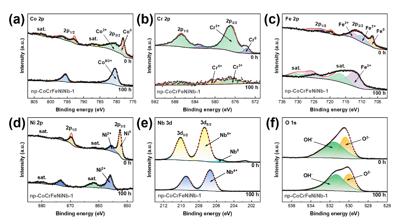 The oxygen evolution reaction (OER) mechanism of the nanoporous CoCrFeNiNb high-entropy alloy catalyst was investigated. High-resolution XPS spectra before and after stability testing revealed that during the OER process, highly catalytically active species such as Co₃O₄, FeOOH, and Ni(OH)₂ were generated on the catalyst surface, serving as the true active sites for the reaction. Additionally, Cr⁶⁺ and Nb⁴⁺ were formed, which facilitated the charge transfer process and modulated the electronic structure of the catalyst surface, thereby enhancing the charge transfer kinetics and reaction dynamics. The synergistic interaction among the multiple elements collectively improved the OER catalytic activity of the catalyst.