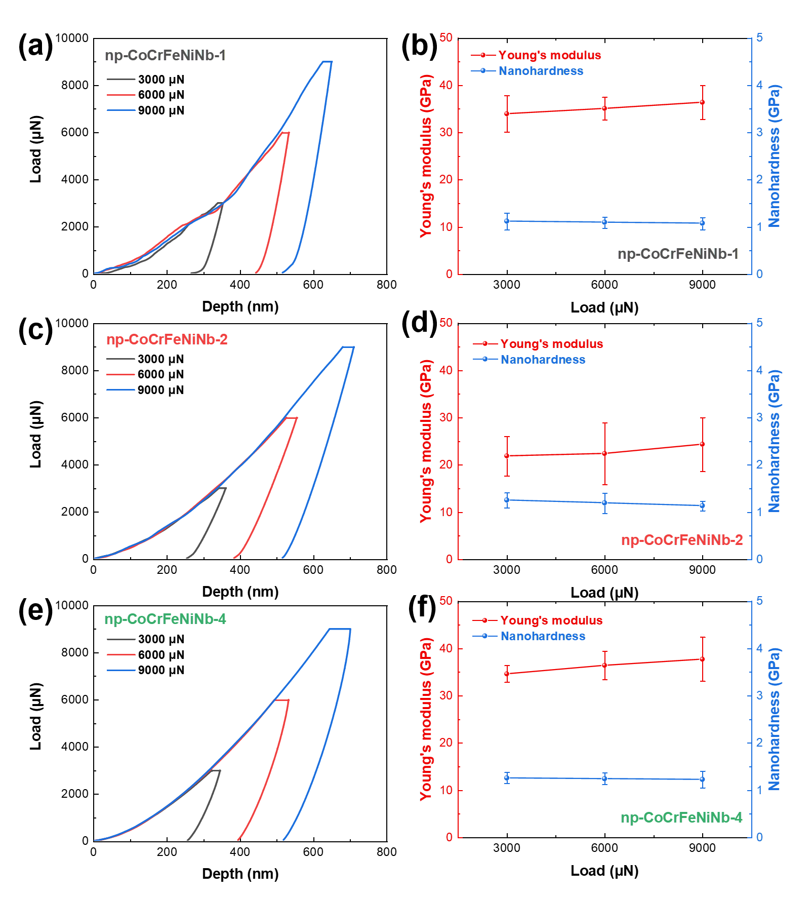 Fig. 6. (a) The indentation load-depth curves of the np-CoCrFeNiNb-1 sample, (b) the nanomechanical properties for the np-CoCrFeNiNb-1 sample, (c) the indentation load-curves of the np-CoCrFeNiNb-2 sample, (d) the nanomechanical properties for the np-CoCrFeNiNb-2 sample, (e) the indentation load-curves of the np-CoCrFeNiNb-4 sample, and (f) the nanomechanical properties for the np-CoCrFeNiNb-4 sample.