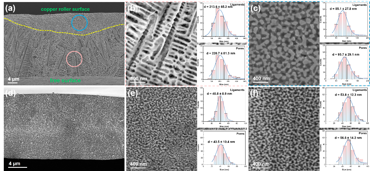 Fig. 3. SEM images of the Precursor-1 sample after dealloying for 30 min of (a) the whole cross-section, (b) the free surface, (c) the copper roller surface, and the Precursor-2 sample after dealloying for 15 min of (d) the whole cross-section, (e) the free surface, and (f) the copper roller surface.