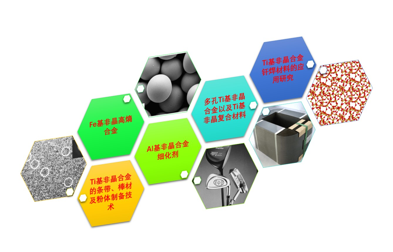 设计与开发了多个系列高性能非晶态合金体系,并在不同领域展开应用研究,主要内容包括:Ti基非晶合金的条带、棒材及粉体制备技术;多孔Ti基非晶合金以及Ti基非晶复合材料;Ti基非晶合金钎焊材料的应用研究;Al基非晶合金及其在铝合金晶粒细化方面的应用研究;Fe基非晶高熵合金及其软磁性能的研究等。